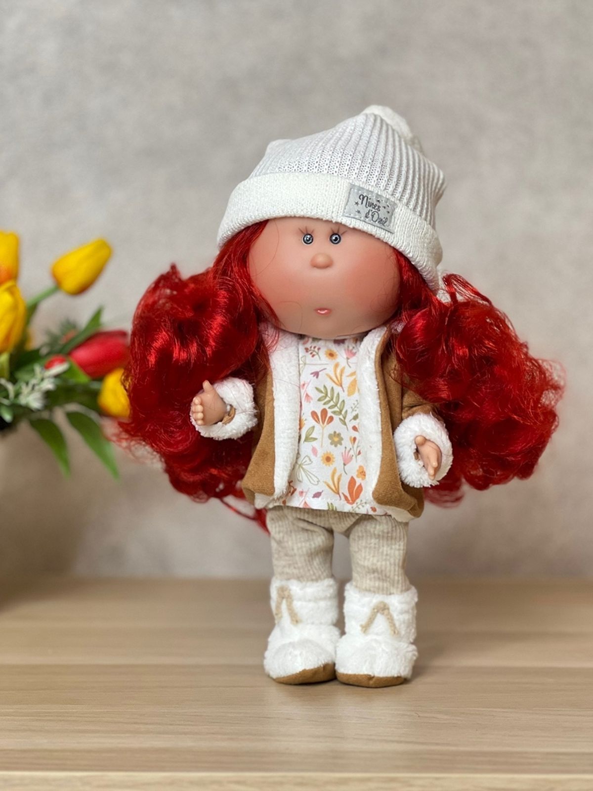 Одета - бежевые штанишки, светлая с рисунком рубашка, коричневое пальтишко с капюшоном, белая шапочка и меховые угги.
