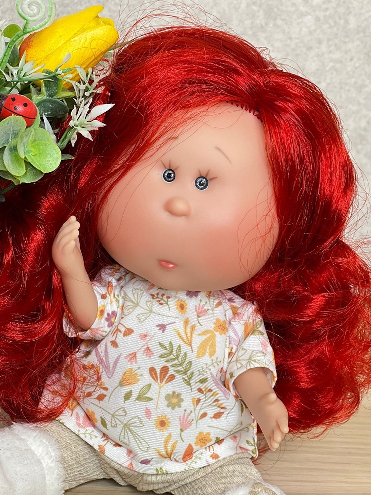 Красные, волнистые волосы (не парик, прошивка по всей голове), можно делать прически.
