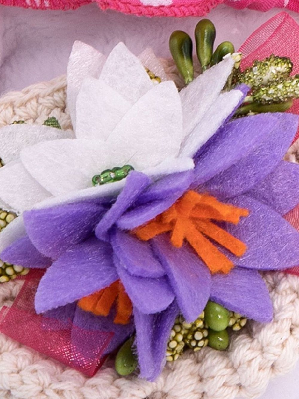 На малышке Ли-Ли трогательная розовая косыночка в белых сердечках. В комплекте - вязаная крючком сумочка натурального цвета, украшенная нежными первоцветами и лентой из органзы.