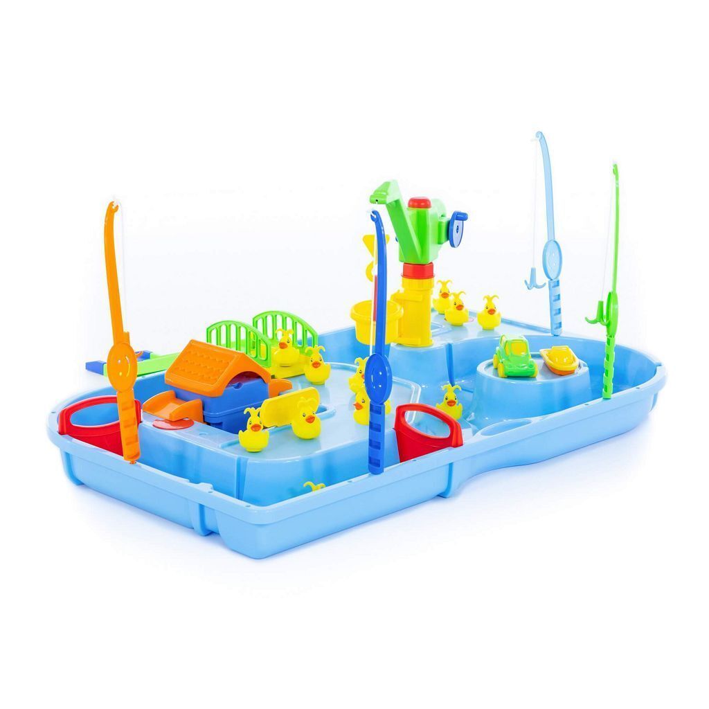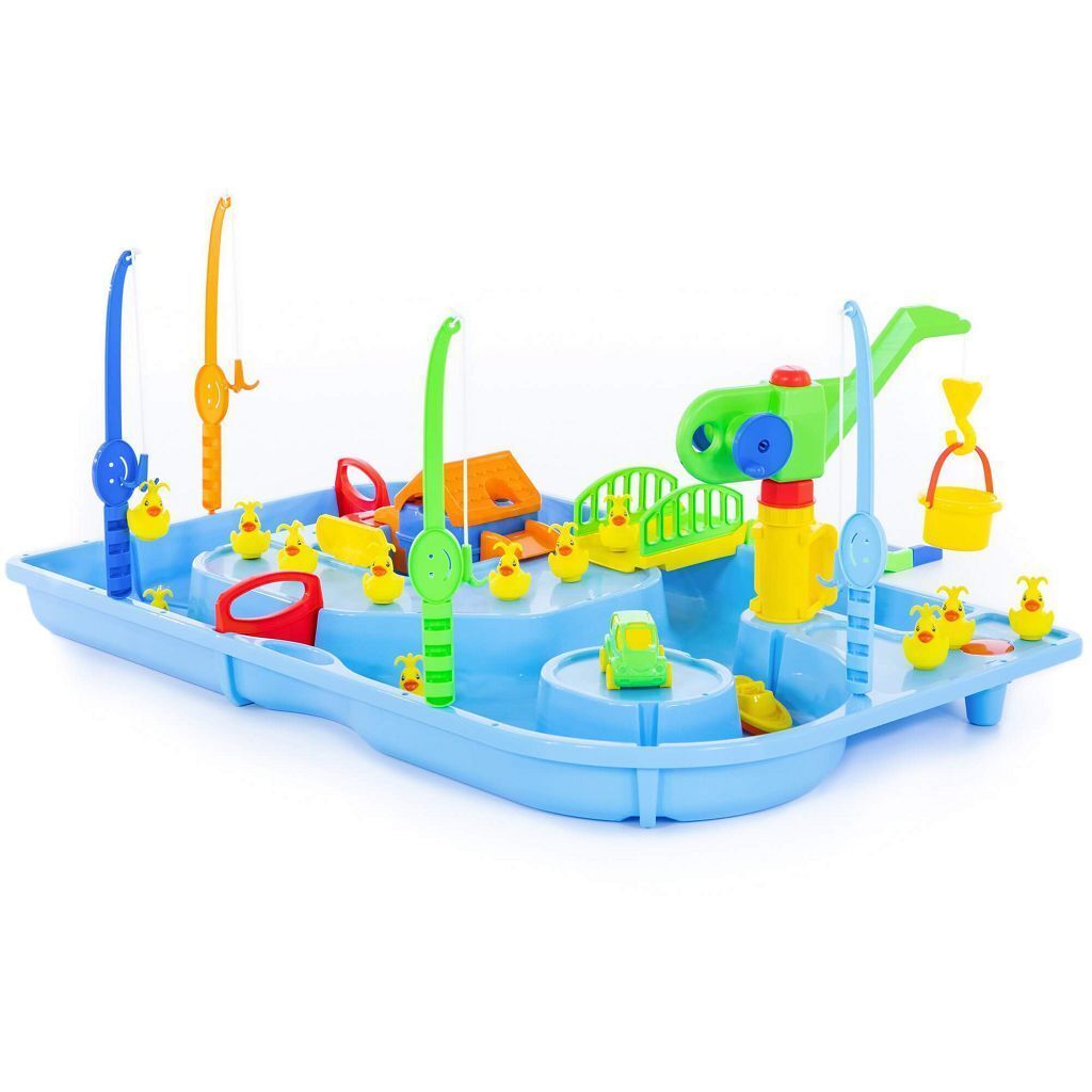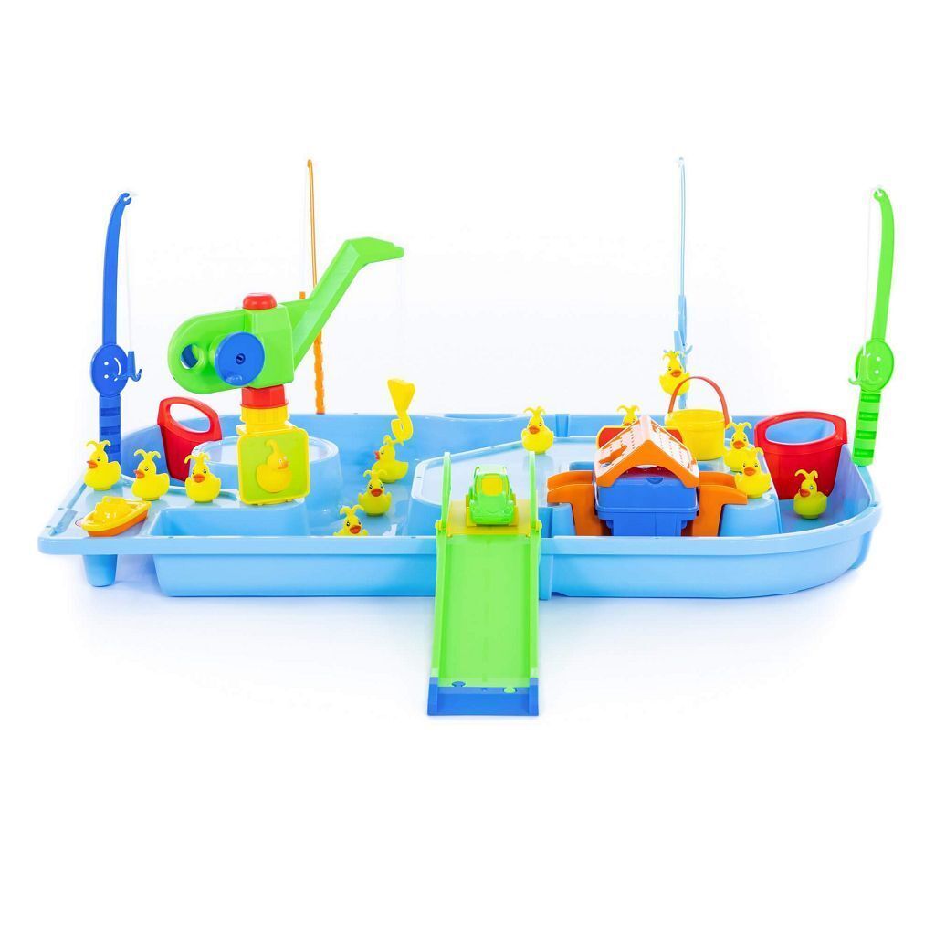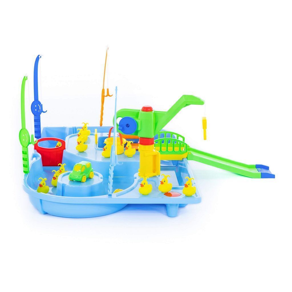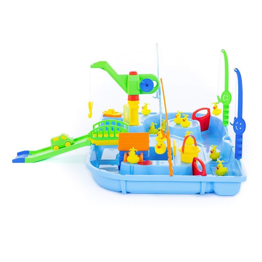 Суть игры Поймай уточку заключается в том, чтобы удочками поймать из воды как можно больше уточек. Всего в наборе 4 удочки и 12 уточек. Уточки двигаются в водичке от работы моторчика, который находится в домике. Включается моторчик путем нажатия кнопки на крыше домика. Также уточек можно ловить и ведерком, а доставать его подъемным краном. В наборе имеются заслонки для воды, лодочка, автомобиль, мостик и спуск. Игра будет интересна и мальчикам, и девочкам. Во время игры детки развивают моторику рук, координацию движений, усидчивость.